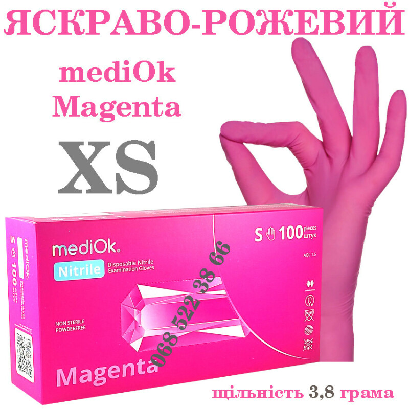 Froomo, маркетплейс професійної косметики та товарів для здоров'я\\Рукавиці нітрилові рожевий Mediok Magenta розмір XS, щільність 3.8 г, уп.100 шт
