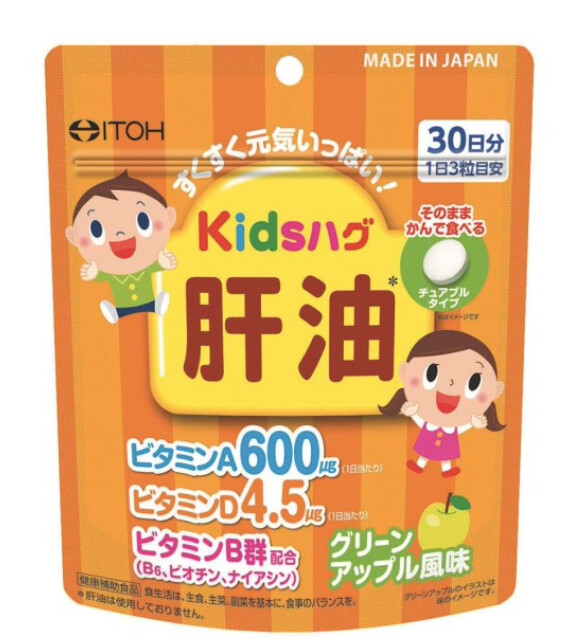 Дитячі вітаміни з олією печінки та вітамінами A, D, H, PP зі смаком зеленого яблука ITOH 90 таб. (курс 30 днів)