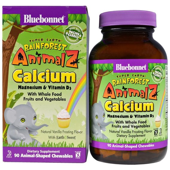 Froomo, маркетплейс професійної косметики та товарів для здоров'я\\Мікроелемент Кальцій Bluebonnet Nutrition Rainforest Animalz Calcium Magnesium And Vitamin D3 90 Chewables Natural Vanilla Frosting Flavor BLB0196