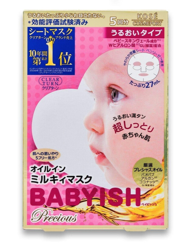 Froomo, маркетплейс професійної косметики та товарів для здоров'я\\Японська зволожуюча тканинна маска для обличчя KOSE Маска CLEAR TURN Babyish Precious, (5 шт.)